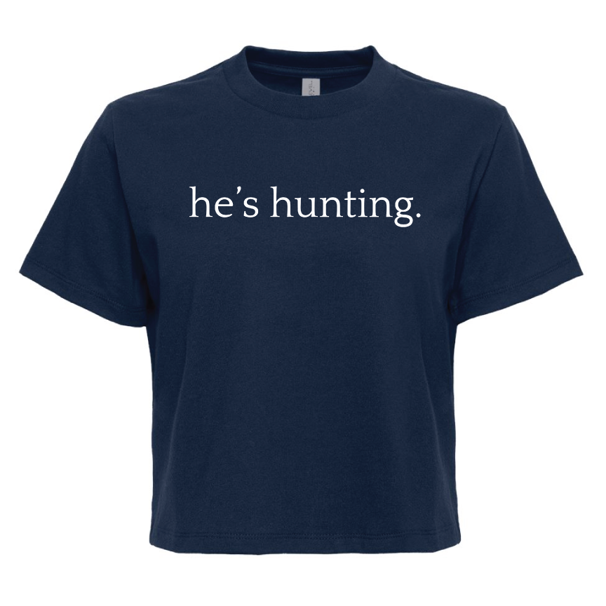 he's hunting printed on a women's heavyweight boxy tee. available in sport grey or navy.
