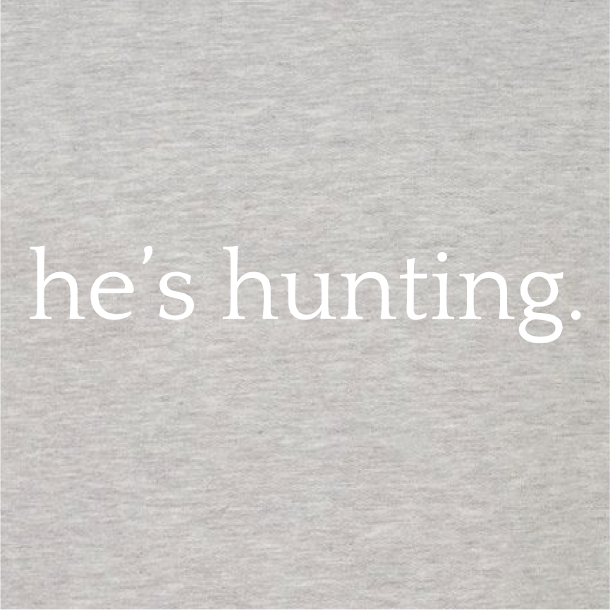 he's hunting printed on a midweight unisex crewneck sweatshirt . available in army green, forest camo, and grey heather.